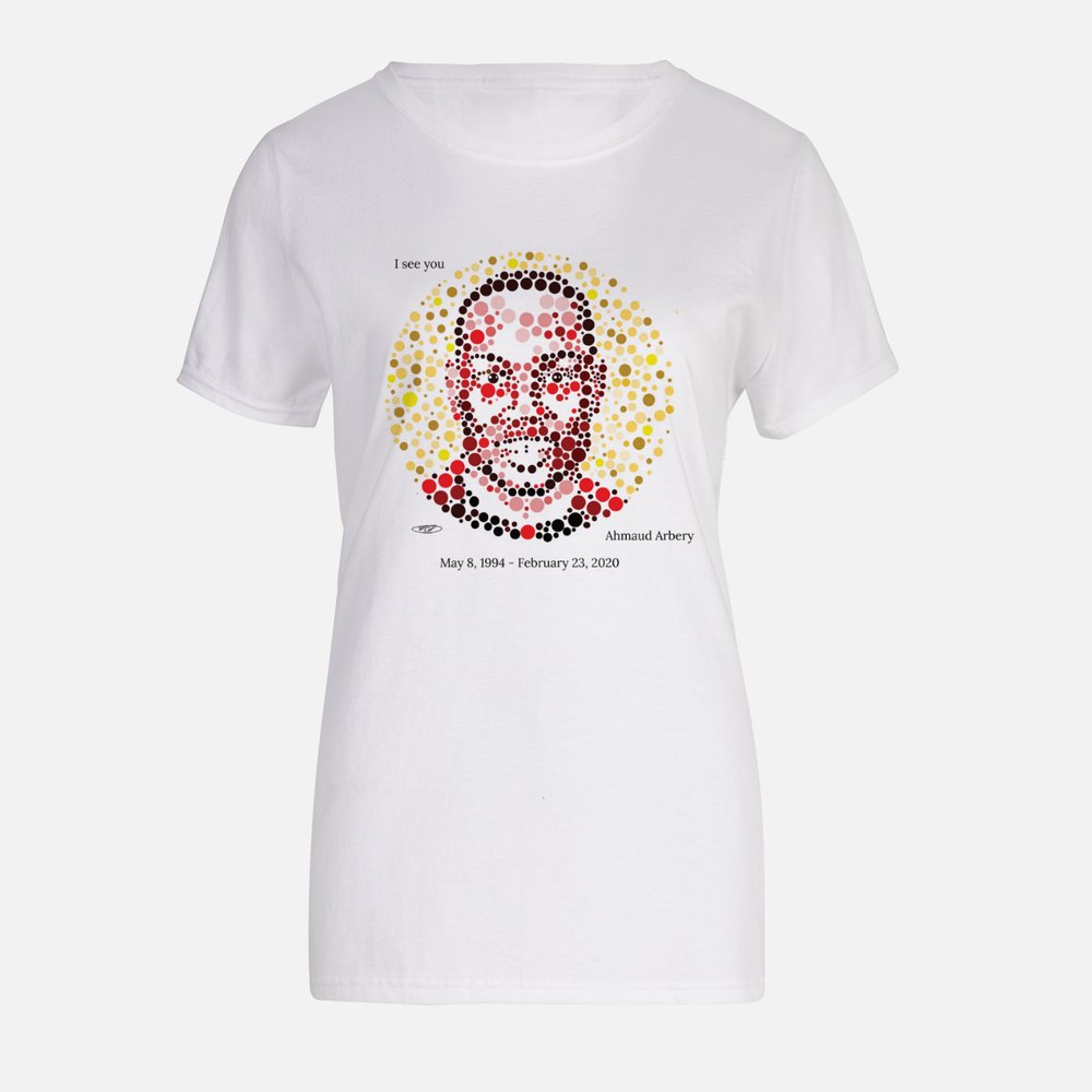 Women's tapered t-shirt with Ahmaud Arbery's portrait on the front and the BLM Mosaic on the back