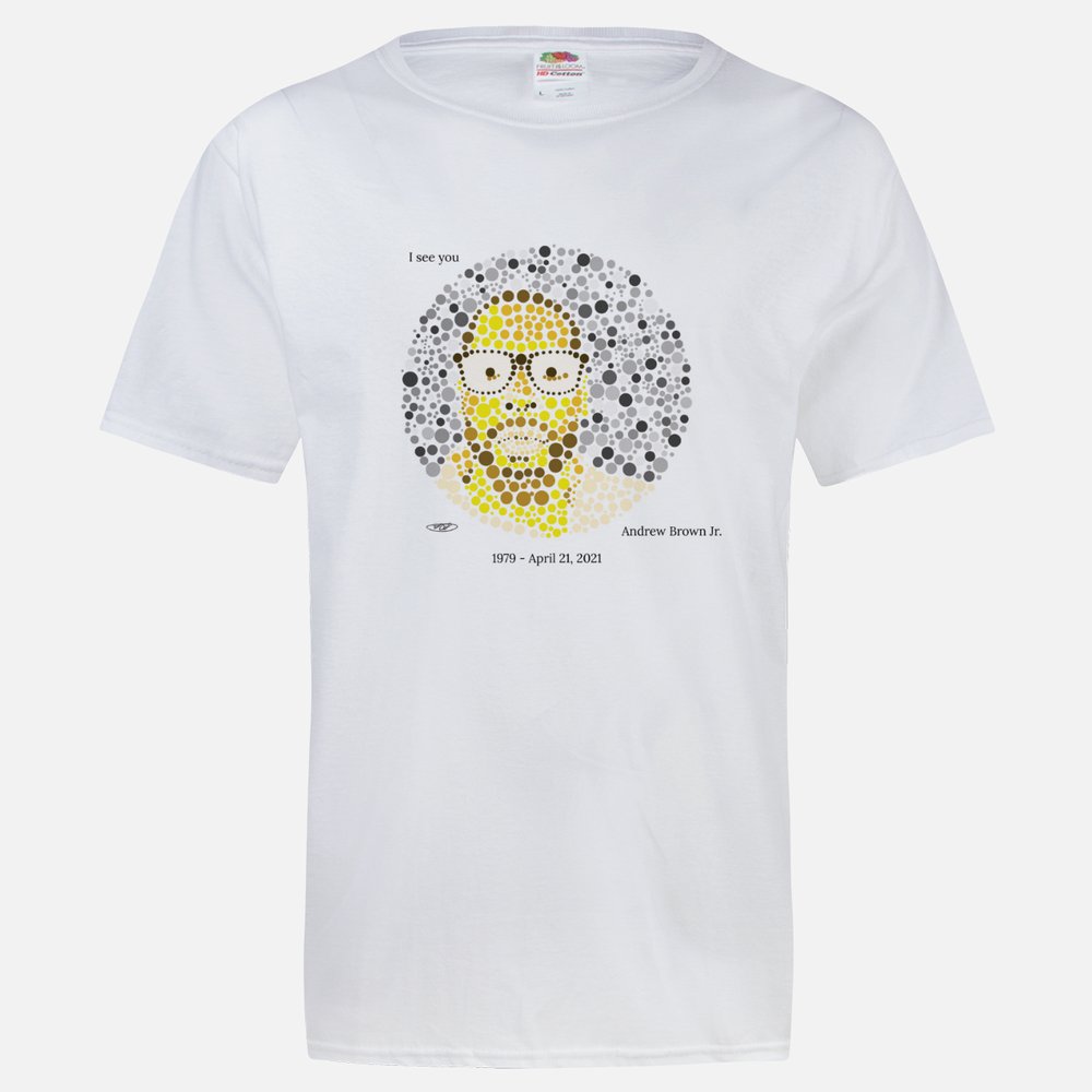 Men's T-Shirt with Andrew Brown's portrait on the front and the BLM Mosaic on the back