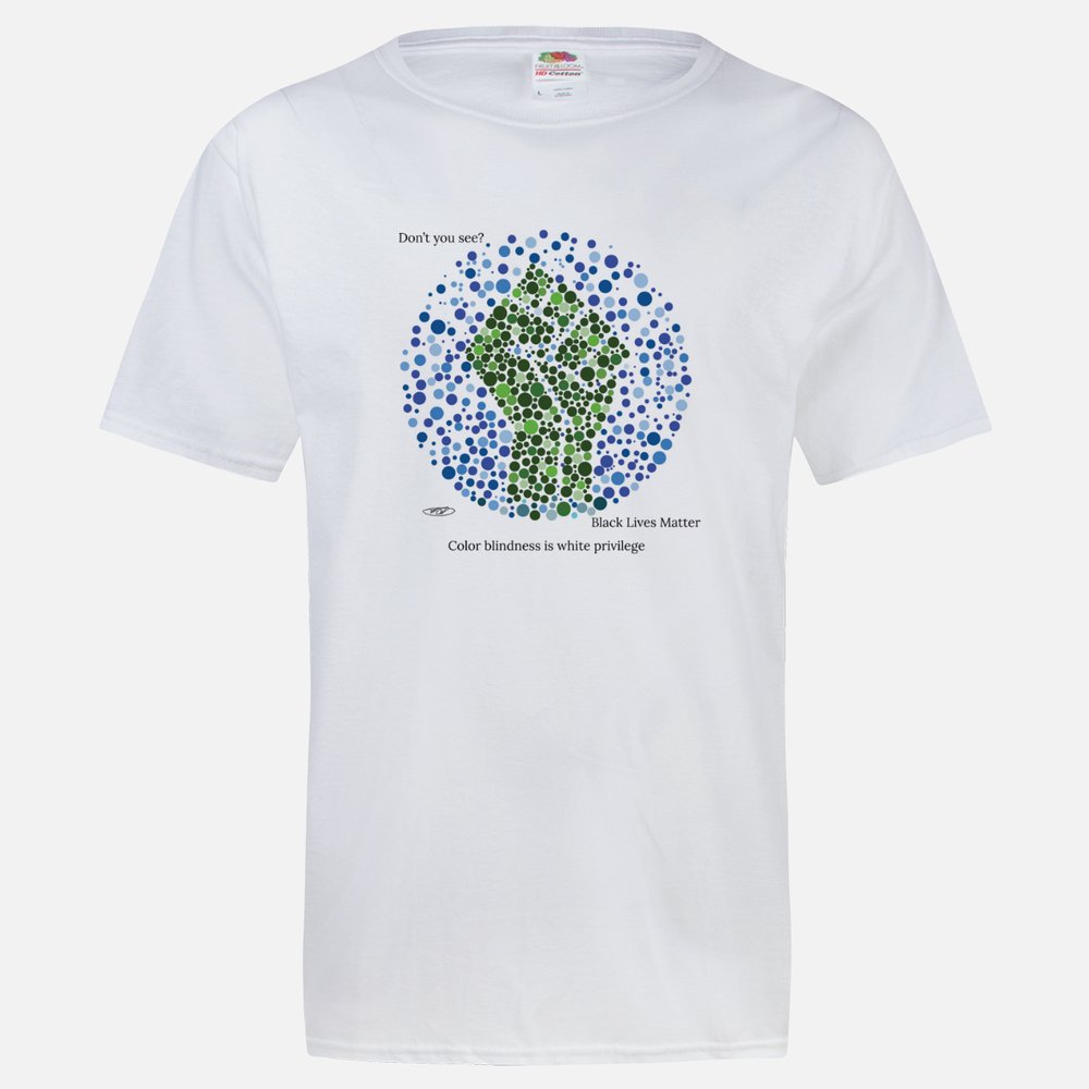 Men's T-Shirt with Black Livers Matter fist in green and blue on the front and the BLM Mosaic on the back
