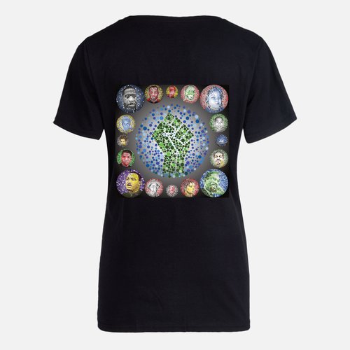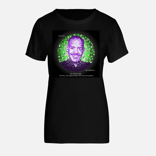 Women's tapered t-shirt with Joe Madison's portrait on the front and the BLM Starburst on the back