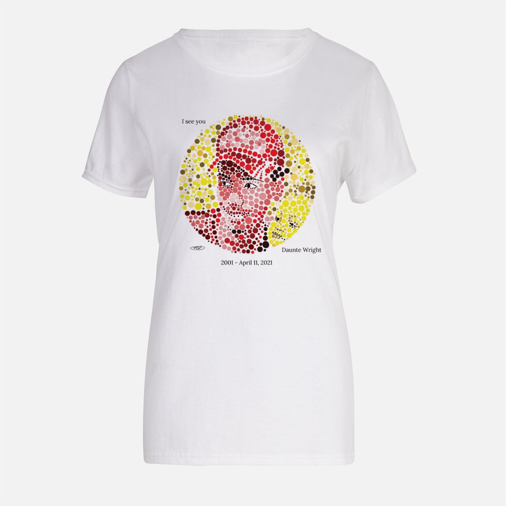 Women's tapered t-shirt with Daunte Wright's portrait on the front and the BLM Mosaic on the back