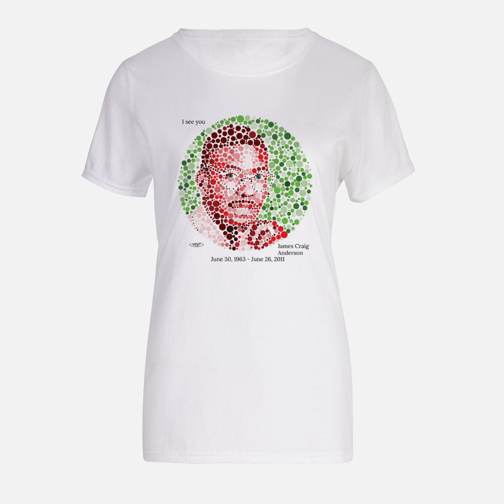 Women's tapered t-shirt with James Craig Anderson's portrait on the front and the BLM Mosaic on the back