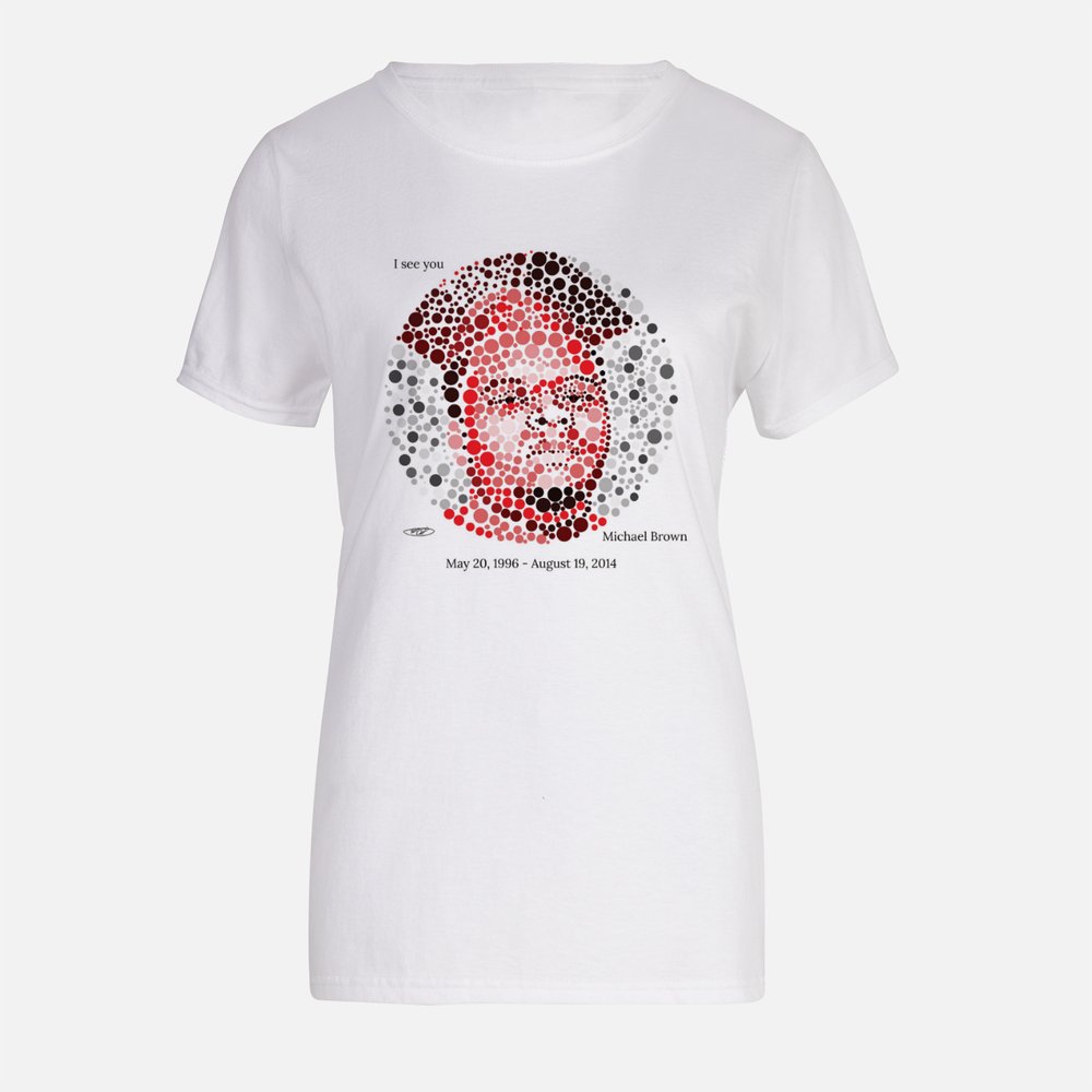 Women's tapered t-shirt with Michael Brown's portrait on the front and the BLM Mosaic on the back