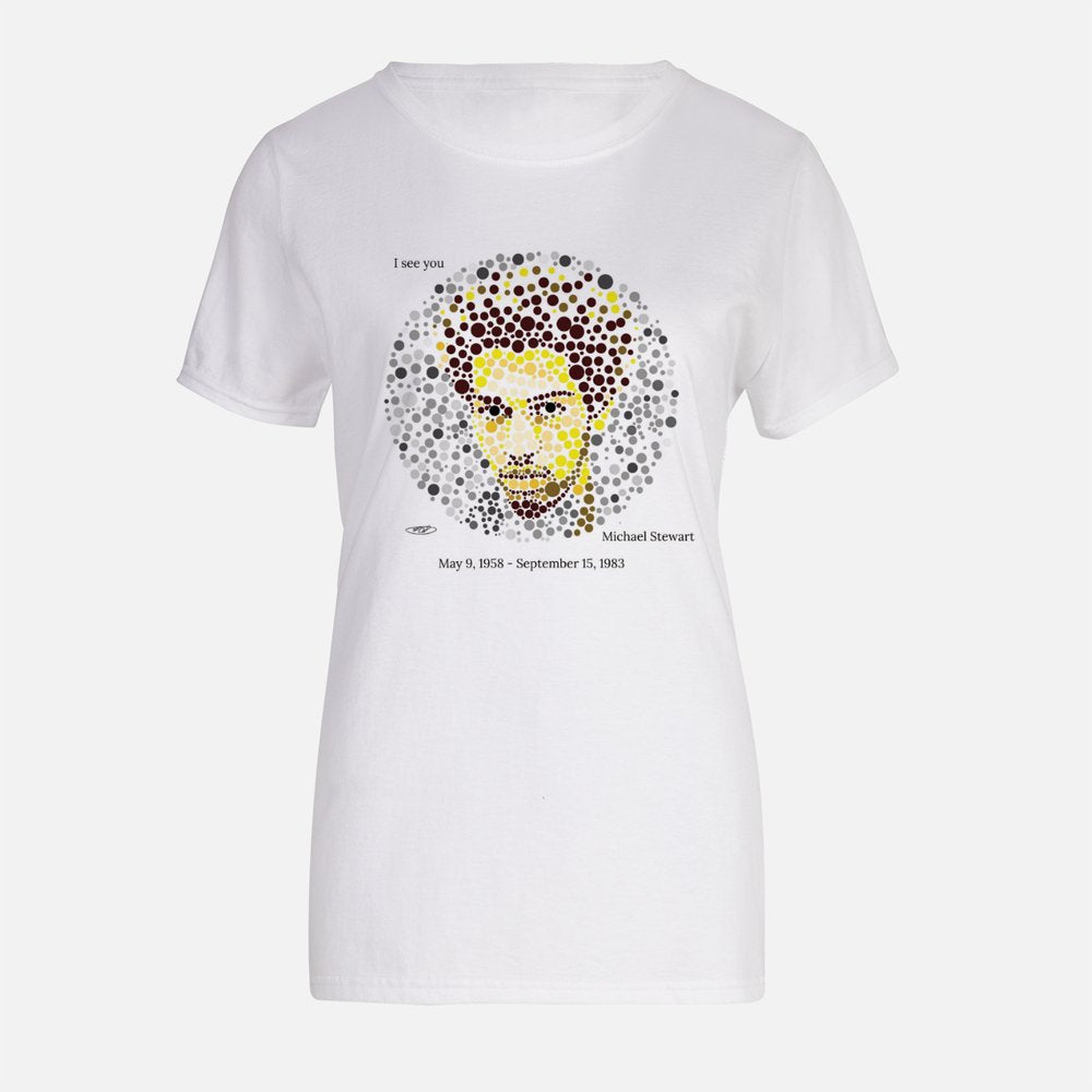 Women's tapered t-shirt with Michael Stewart's portrait on the front and the BLM Mosaic on the back