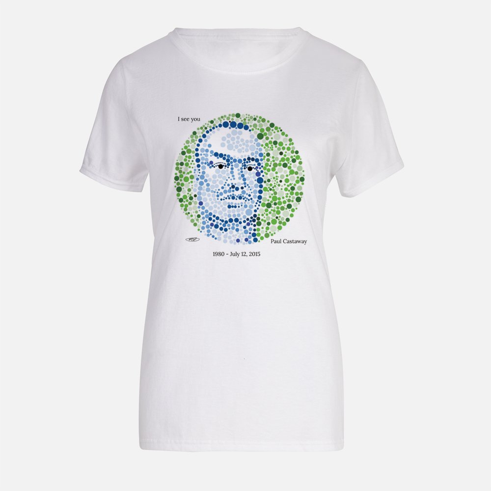 Women's tapered t-shirt with Paul Castaway's portrait on the front and a Mosaic of portraits on the back
