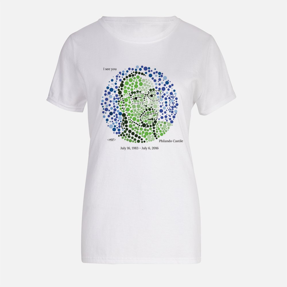 Women's tapered t-shirt with Philando Castile's portrait on the front and the BLM Mosaic on the back