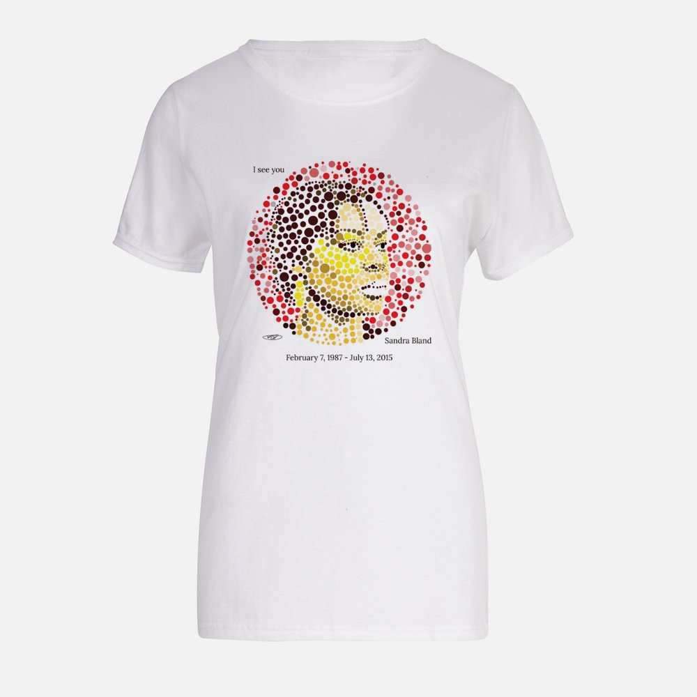 Women's tapered t-shirt with Sandra Bland's portrait on the front and the BLM Mosaic on the back