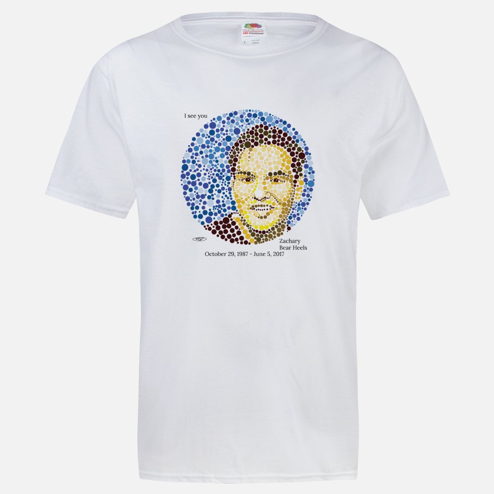 Men's T-Shirt with Zachary Bear Heels' portrait on the front and the a Mosaic on the back