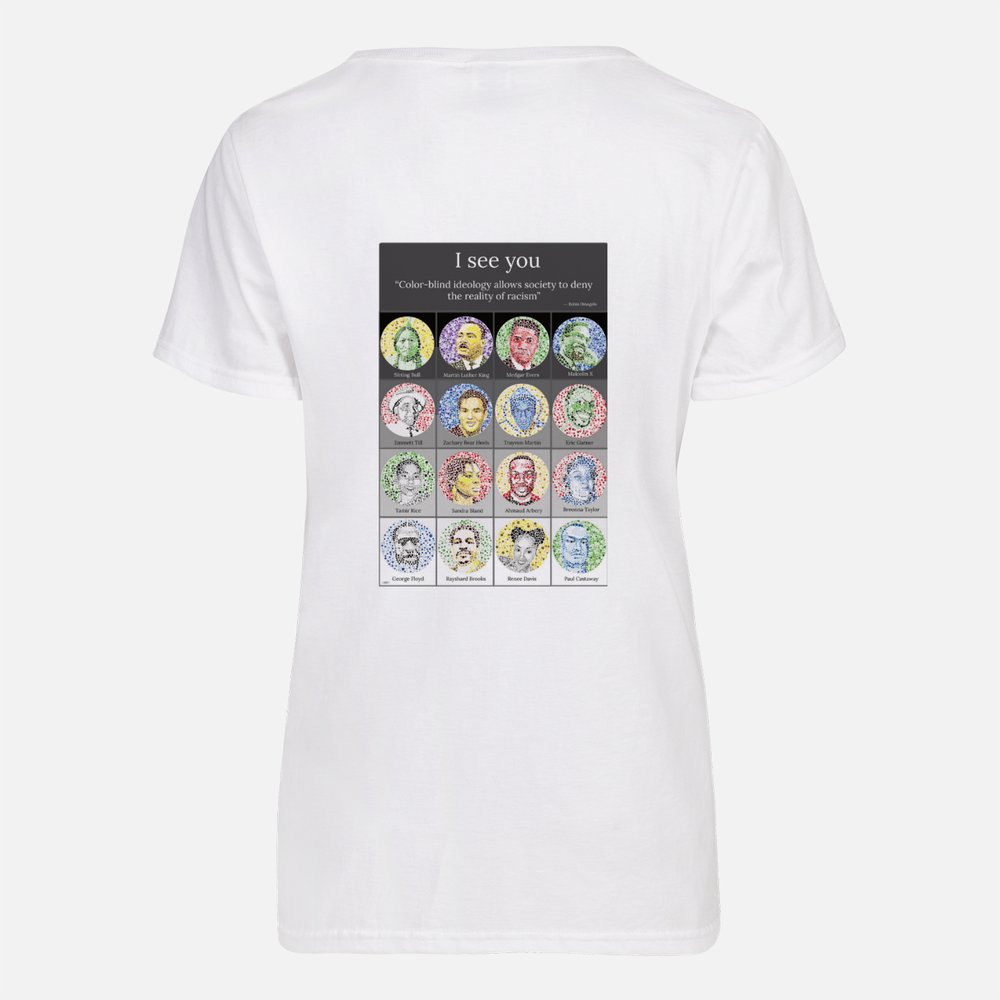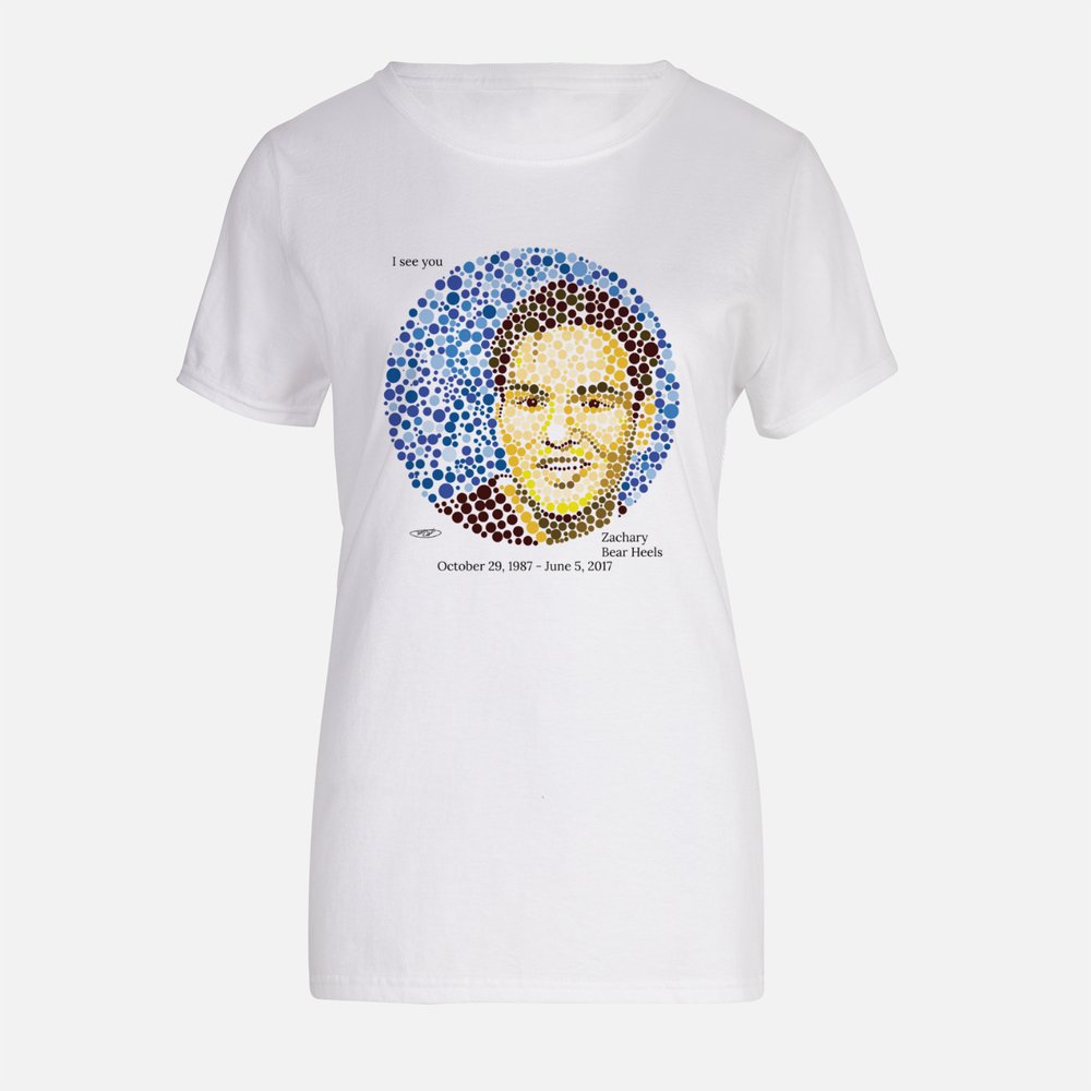 Women's tapered t-shirt with Zachary Bear Heels' portrait on the front and a Mosaic of portraits on the back